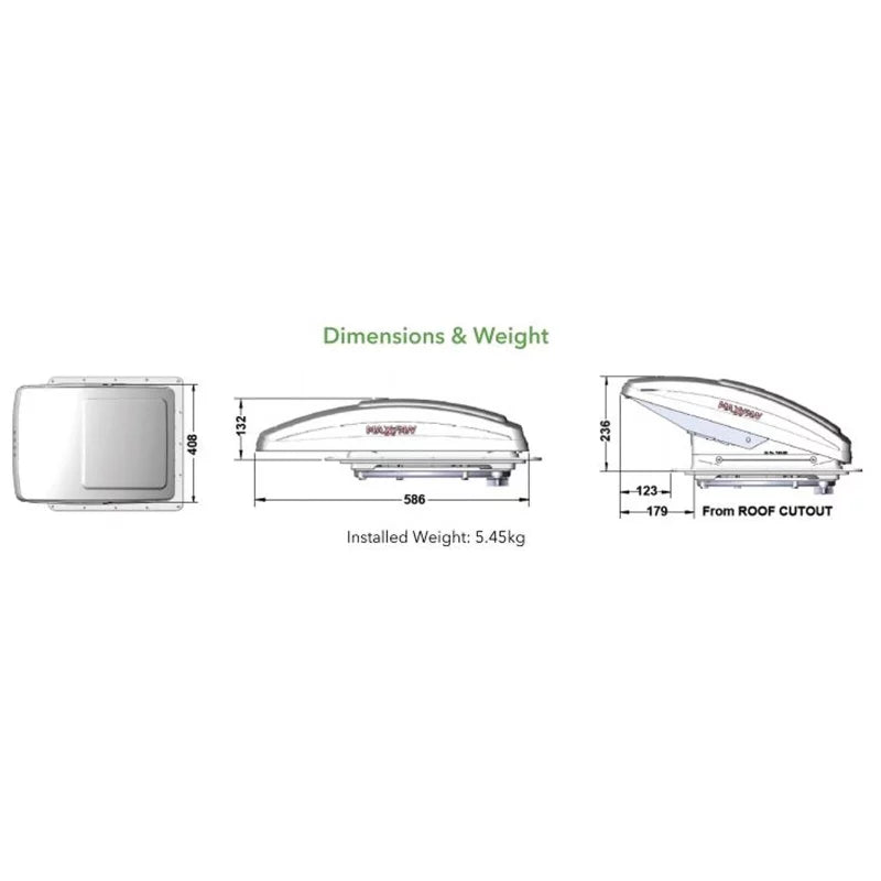 Integroidun sadesuojan ansiosta voit pitää tuuletusluukun auki säällä kuin säällä, ja termostaatti auttaa säätelemään huonelämpötilaa. Tuuletin avautuu ja sulkeutuu automaattisesti kaukosäätimellä tai käsinapilla, aivan kuten tavallinen matkailuajoneuvon kattoluukku. Se on helppo asentaa ja sopii kaikkiin standardikokoisiin 40 x 40 cm kattoluukkuihin.
